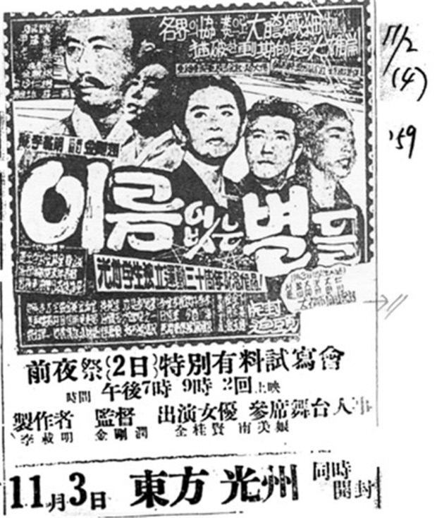 오는 11월 3일은 ‘광주학생독립운동(약칭 운동)’ 기념일이다. 1929년 11월부터 다음 해 5월까지 이어진 ‘운동’은 광주에서 시작하여 호남을 거쳐 서울을 비롯한 전국 각지로 이어진 항일 민족주의 운동이다. 또한, 1919년 3·1 운동 이후 국내 최대규모의 항일운동으로 기록되는 사건이다. 흥미롭게도 ‘운동’이 발생한 지 30년이 지난 1959년 해당 운동을 극적으로 재현한 영화 ‘이름 없는 별들’이 개봉하였다. 시나리오 작가 출신 김강윤의 감독 데뷔작이자 이재명이 대표를 맡은 아세아영화사의 영화였다.