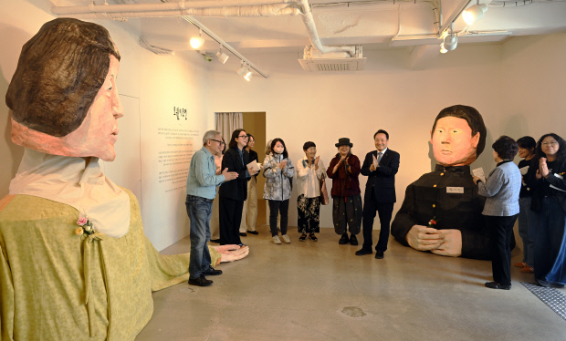 14일 광주시 동구 미로센터에서 1980년 5월의 아픔을 되새기고 ‘추모와 기억’을 표현한 ‘오월, 종이로 빚은 시간’ 전 개막 행사가 열린 가운데 임택 동구청장, 엄정애 작가와 제작에 참여한 시민작가들이 함께 작품을 둘러 보고 있다. 전시 작품들은 시민 작가들이 직접 만든 종이 인형과 신발 등 24점과 엄정애 작가의 개인작품이 30일까지 전시된다. /나명주 기자 mjna@kwangju.co.kr