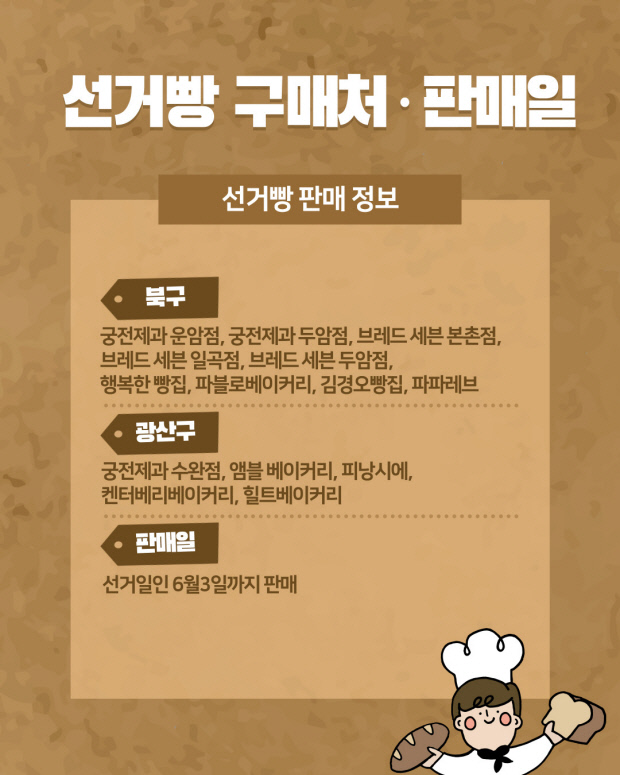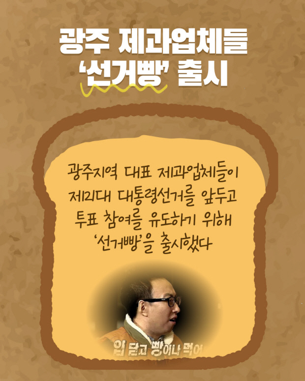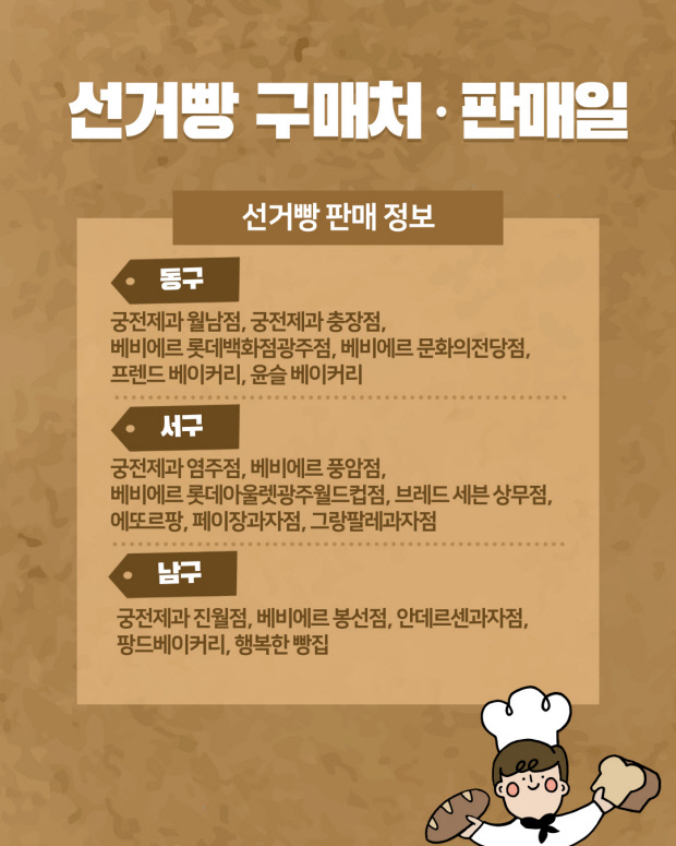 궁전제과, 베비에르, 브레드세븐 등 광주 지역 유명 제과점부터 골목 빵집까지 대한제과협회 광주전남지회 회원 다수가 선거빵을 출시했습니다.
