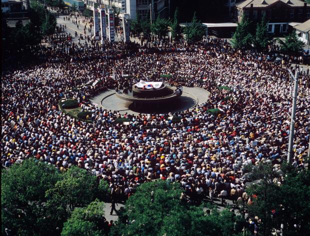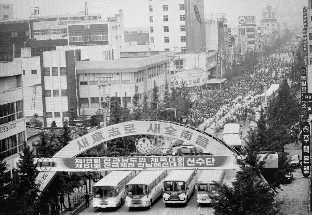 ![]() 광주일보 취재진이 포착한 민족민주화성회 마지막 날인 1980년 5월 16일 도청분수대에 모인 시민들. |