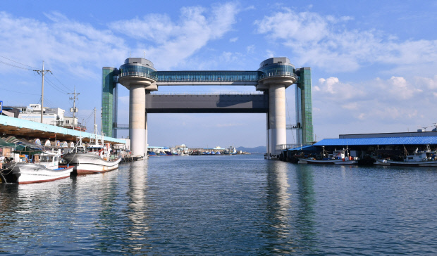 ![]() 길이 50m 높이 7m 철제수문이 항구 입구를 차단하는 지진해일 수 방지시설. |