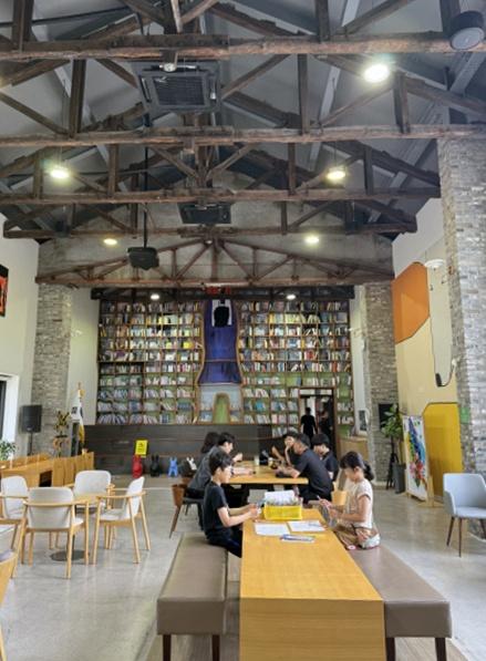 특히 높은 층고와 천장 높이의 서가가 압도적인 스케일을 자랑한다. 폐창고의 역사를 보존하기 위해 건물 내부의 천장을 마감하지 않고 목재 트러스 구조를 그대로 유지한 덕분이다. 공간의 중심은 ‘소통·교류·동행’을 콘셉트로 내건 문화쉼터가 꾸며져 있다. 푸드트럭을 떠올리게 하는 카페가 실내에 설치돼 색다른 분위기를 연출한다. 시민들과 방문객들은 이 곳에서 자유롭게 차를 즐기며 휴식을 취할 수 있다.