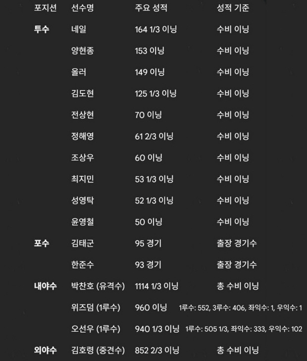 ![]() KIA 2025 KBO 수비상 후보 명단. |