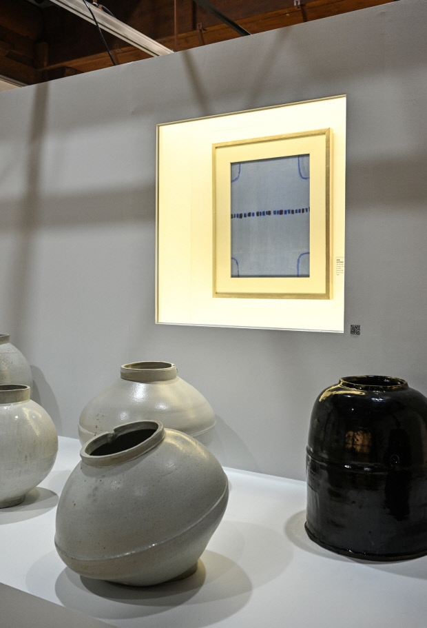 김환기의 1966년 추상화 ‘무제’는 점 하나하나가 우주처럼 확장되는 전면점화의 세계를 보여주었고 바로 아래 전시된 이헌정의 도자는 우연한 찌그러짐조차 예술적 가치를 획득할 수 있다는 메시지를 던졌다. 홍푸르메 작가의 설치 작품 ‘심향각’은 관람객이 직접 꽃을 꽂고 향을 맡으며 체험하는 공간으로 수묵을 ‘보는’ 예술에서 ‘느끼는’ 예술로 확장시켰다. 폭포를 연상시키는 비백(飛白) 기법의 선, 상선약수(上善若水)의 글귀, 두루미에서 영감을 얻은 오브제까지 오감을 자극하는 체험은 전통 수묵의 철학이 현대적 감각으로 다시 피어나는 순간이었다.