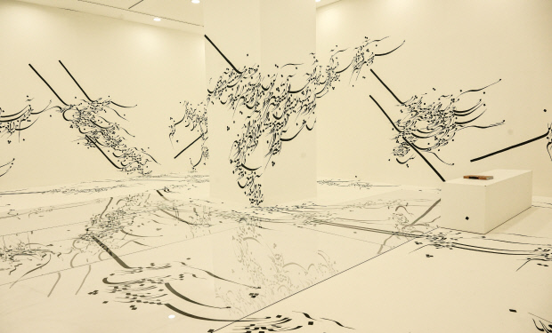 <> 이란 출신 작가 파라스투 포로우하르의 설치작품 ‘Written Room(쓰인 방)’은 눈에 띄는 장면을 만들었다. 신발을 벗고 들어간 공간에는 벽과 바닥, 천장 가득 페르시아 알파벳이 춤을 추듯 그려져 있다. 작가가 14일간 현장에 머물며 전시장 내부 벽면에 드로잉 형식으로 구현한 작품이다.