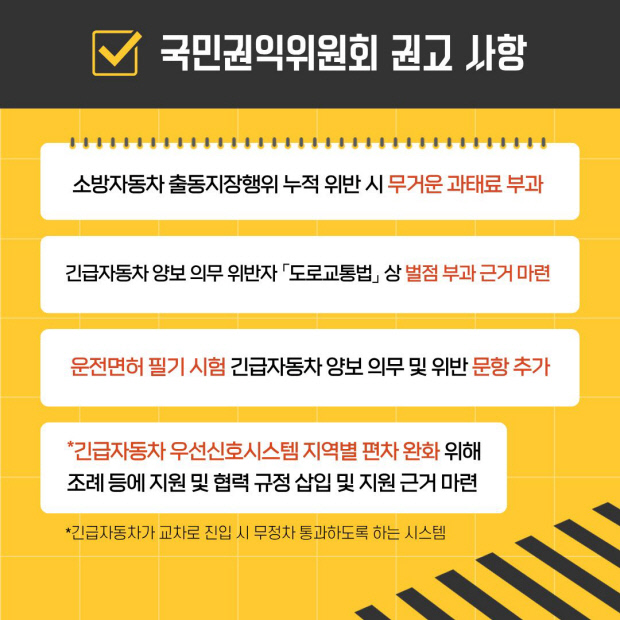 국민권익위원회는 소방자동차 출동지장행위가 누적되면 무거운 과태료를 부과하거나 관련 조례에 ‘긴급자동차 우선신호시스템’ 지역별 편차 완화를 위한 규정을 삽입하는 등의 방안을 제안했다.