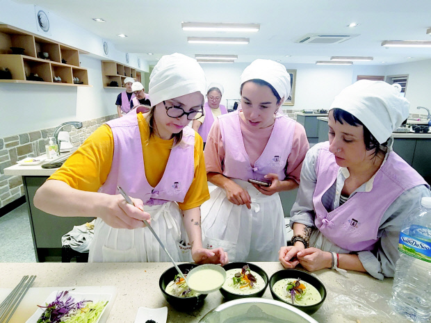 ![]() 구례 화엄사가 마련한 ‘오색오미! 사찰음식에 빠져들다’라는 주제의 템플스테이에서 사찰 음식을 체험하고 있는 외국인 여행객들. |