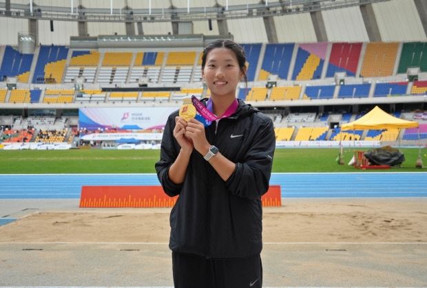 ![]() 20일 부산아시아드주경기장에서 열린 제106회 전국체육대회 여자 18세 이하부 세단뛰기에서 금메달을 차지한 광양하이텍고 서예지가 금메달을 들고 포즈를 취하고 있다. |