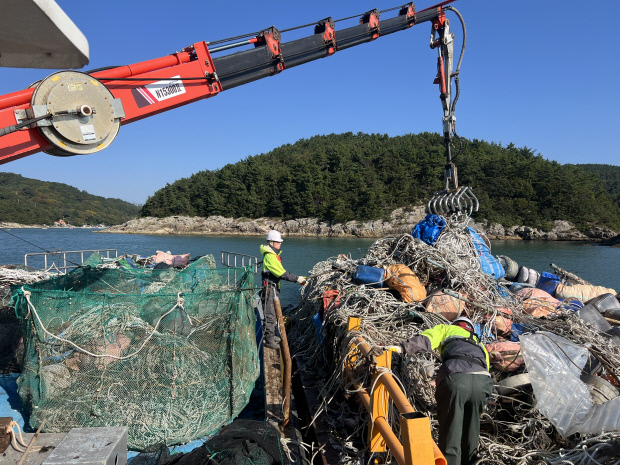 10ℓ짜리 폐유통, 3m가 훌쩍 넘는 철 막대기, 폭 2여m의 검은 비닐봉지 등이 선박 끝에 설치한 커다란 망으로 쉴 새 없이 들어갔다. 갑판 위 설치된 0.5t용량 크레인이 집게로 그물과 로프를 들어 올릴 때마다 바닷바람에 스티로폼 조각 등 쓰레기가 흩날렸다.