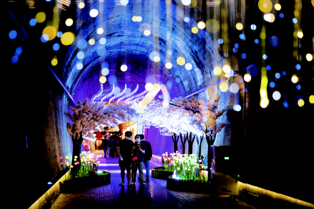 동굴 내부는 ‘돌무더기 정령’이라는 스토리텔링을 중심으로 구성됐다. 폐쇄됐던 생림터널의 과거를 재조명하는 콘텐츠는 자연의 4요소인 빛, 소리, 바람, 매화를 활용해 감각적으로 풀어냈다. 터널의 시간성과 감성을 시각화한 콘텐츠는 방문객의 오감을 자극하며 깊은 인상을 남긴다.