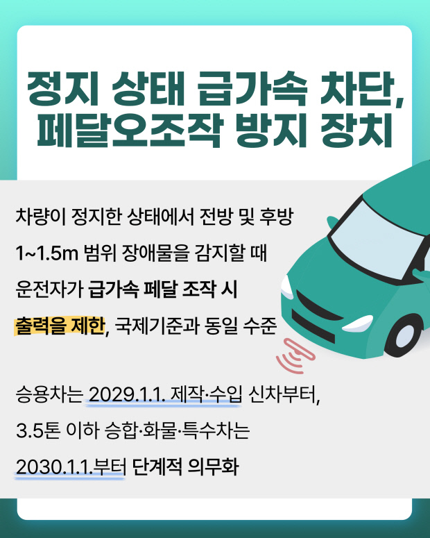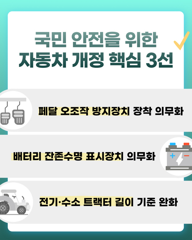 이번 개정령안에는 자동차의 페달 오조작에 따른 급가속 사고를 예방하기 위한 신차 페달오조작 방지장치 설치 의무화와 전기차 배터리의 잔존수명을 확인할 수 있는 표시장치 설치 의무화에 대한 내용이 담겨 있다.