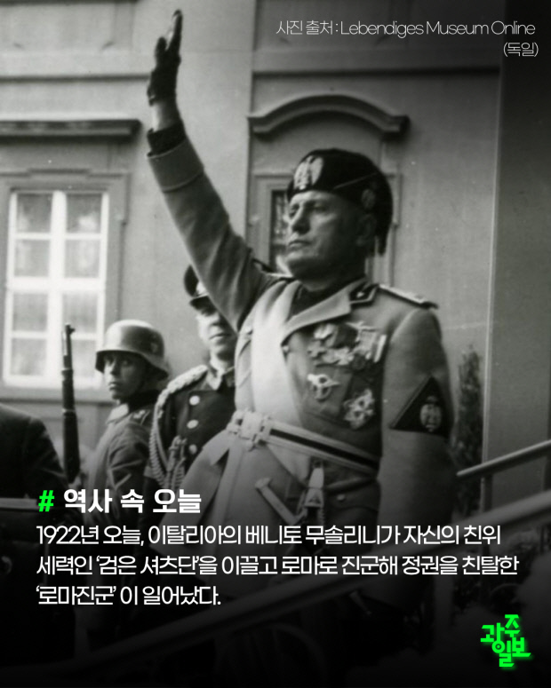 1922년 오늘, 이탈리아의 베니토 무솔리니가 자신의 친위 세력인 ‘검은 셔츠단’을 이끌고 로마로 진군해 정권을 친탈한 ‘로마진군’ 이 일어났다.