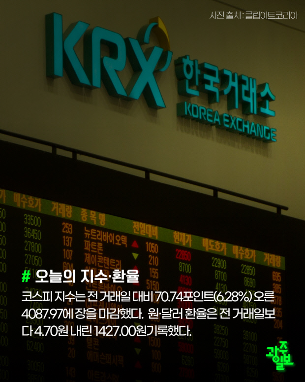 코스피 지수는 전 거래일 대비 70.74포인트(6.28%) 오른 4087.97에 장을 마감했다. 원·달러 환율은 전 거래일보다 4.70원 내린 1427.00원기록했다.
