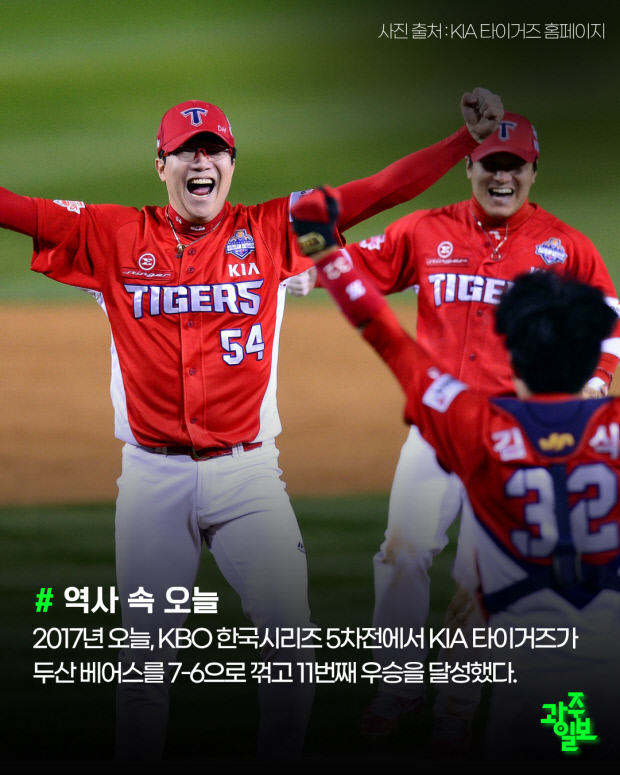 2017년 오늘, KBO 한국시리즈 5차전에서 KIA 타이거즈가 두산 베어스를 7-6으로 꺾고 11번째 우승을 달성했다.