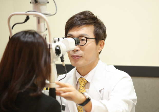 ![]() 김재봉 신세계안과 원장이 시력교정술을 원하는 환자의 각막 상태를 살펴보고 있다. |