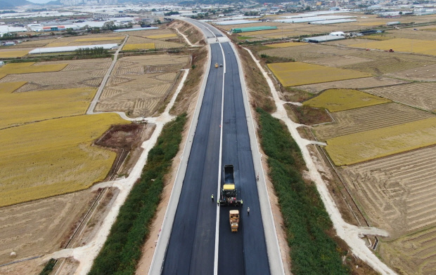 ![]() 나주시 남평면의 광주~강진 구간 공사현장에서 도로 포장 공사가 한창이다. |