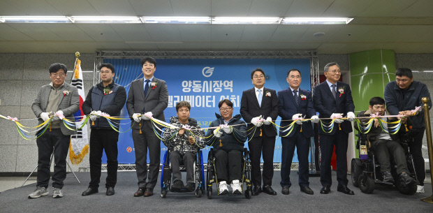 9일 오전 광주 서구 양동시장역에서 열린 외부엘리베이터 설치공사 착공식에서 강기정 광주시장과 강수훈 시의원, 장애인차별철폐연대 관계자 등 주요 내빈들이 기념 테이프를 자르고 있다. /김진수 기자 jeans@