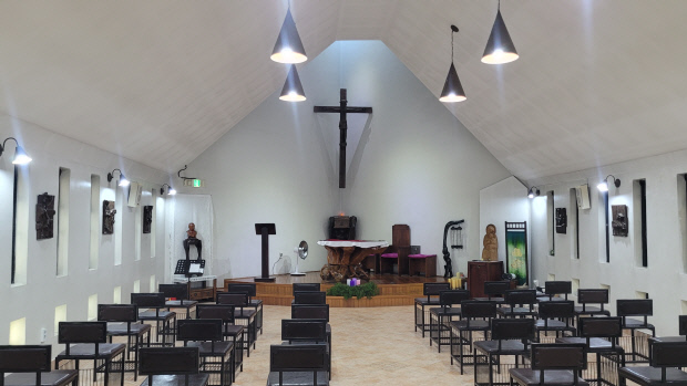 김인환 신부 안내로 출입금지 지역을 제외한 수도원을 둘러봤다. 방문객들이 편히 쉬어갈 수 있는 휴게 공간을 지나면 홍성담 화백이 5·18을 테마로 그린 ‘사시사철-봄’이 걸린 작은 로비가 나온다. 공연이 열렸던 소박한 성당으로 향했다. 방석을 깔고 미사를 드리기도 하는데 지금은 가지런히 의자가 놓여 있다. 규모는 작지만 작은 천창으로 들어오는 빛을 받으며 걸려 있는 나무 십자가, 송현섭 신부가 직접 제작한 제대와 벽면을 채운 조각 등이 인상적이다. 사제와 피정 온 사람들만 이용하던 성당은 이제 누구에게나 열려 있다. 오전 9시부터 오후 6시까지 문을 열며 매일 아침 7시 미사를 개최한다.