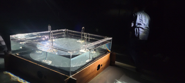 섬광의 ‘Threshold of light’는 보이지 않는 소리를 어떻게 드러낼 것인가에서 착안한 작품이다. 대형 수조에 끊임없이 물이 흐르고, 관람객은 작은 막대기를 수조에 넣어 생성되는 소리를 들을 수 있다.