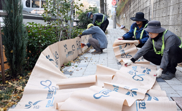 ![]() 10일 광주시 북구 두암동 한 어린이보호구역 인도 경사로에서 북구청 공원녹지과 직원들이 겨울철 제설제로 인한 가로화단 피해 방지를 위해 방풍벽을 설치하고 있다. /나명주 기자 mjna@kwangju.co.kr |