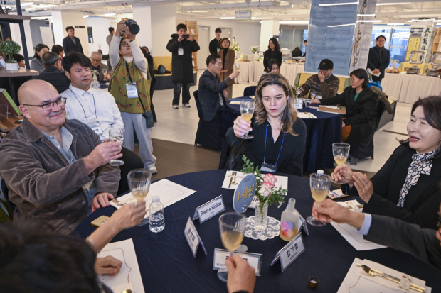 10일 오후 광주 동구 전일빌딩245에서 열린 한강 작가 노벨문학상 수상 1주년 기념 환영 만찬에서 피에르 비지우(Pierre Bisiou), 마야 웨스트(Maya West) 등 번역가 및 참석자들이 만찬의 시작을 알리는 건배를 나누고 있다.