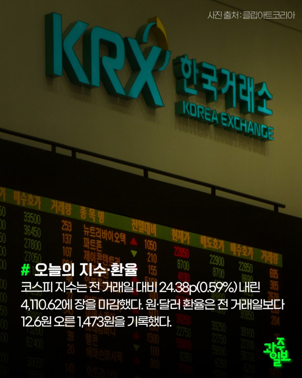 코스피 지수는 전 거래일 대비 24.38p(0.59%) 내린 4,110.62에 장을 마감했다.