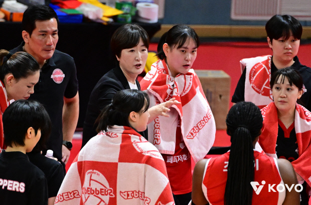 ![]() 12일 페퍼스타디움에서 열린 정관장과의 맞대결에서 페퍼스 장소연 감독이 작전 타임 중 선수들과 대화를 나누고 있다.