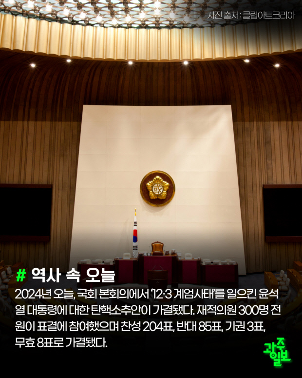 2024년 오늘, 국회 본회의에서 ‘12·3 계엄사태’를 일으킨 윤석열 대통령에 대한 탄핵소추안이 가결됐다. 재적의원 300명 전원이 표결에 참여했으며 찬성 204표, 반대 85표, 기권 3표, 무효 8표로 가결됐다.