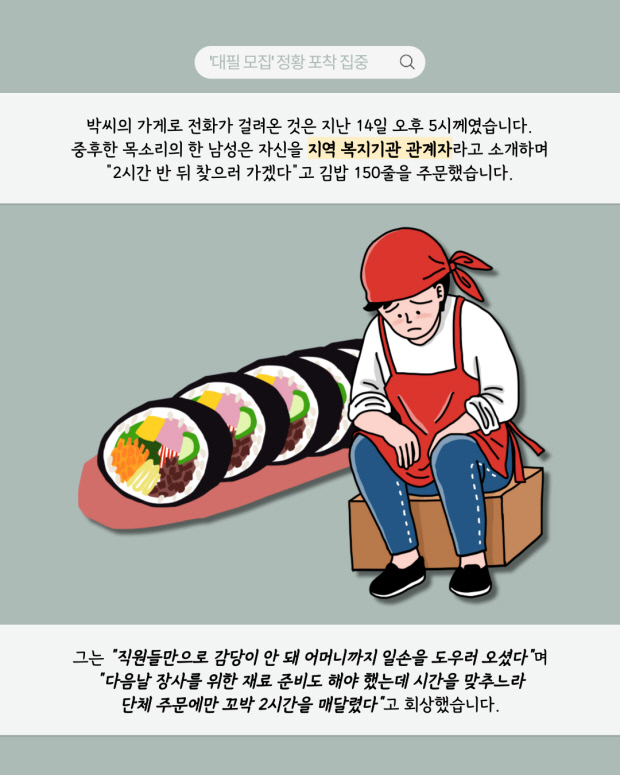 박씨의 가게로 전화가 걸려온 것은 지난 14일 오후 5시께였습니다. 중후한 목소리의 한 남성은 자신을 지역 복지기관 관계자라고 소개하며 “2시간 반 뒤 찾으러 가겠다”고 김밥 150줄을 주문했습니다.