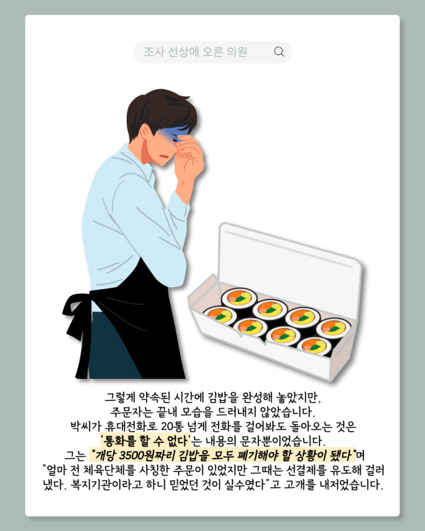 그렇게 약속된 시간에 김밥을 완성해 놓았지만, 주문자는 끝내 모습을 드러내지 않았습니다. 박씨가 휴대전화로 20통 넘게 전화를 걸어봐도 돌아오는 것은 ‘통화를 할 수 없다’는 내용의 문자뿐이었습니다.