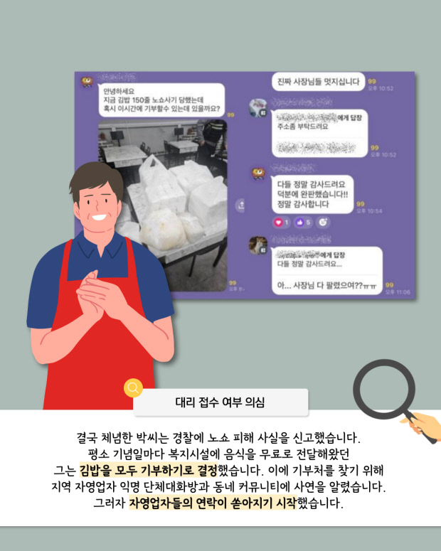 결국 체념한 박씨는 경찰에 노쇼 피해 사실을 신고했습니다. 평소 기념일마다 복지시설에 음식을 무료로 전달해왔던 그는 김밥을 모두 기부하기로 결정했습니다. 이에 기부처를 찾기 위해 지역 자영업자 익명 단체대화방과 동네 커뮤니티에 사연을 알렸습니다.