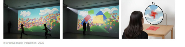 병원 전시 작품인 ‘바람, 개비’는 이색적이면서도 흥미롭다. 관객이 색종이에 적은 소원이 디지털 바람개비로 변환돼 스크린 속에서 회전을 한다. 관객이 입으로 바람을 불면 그에 따라 바람개비가 변환한다.