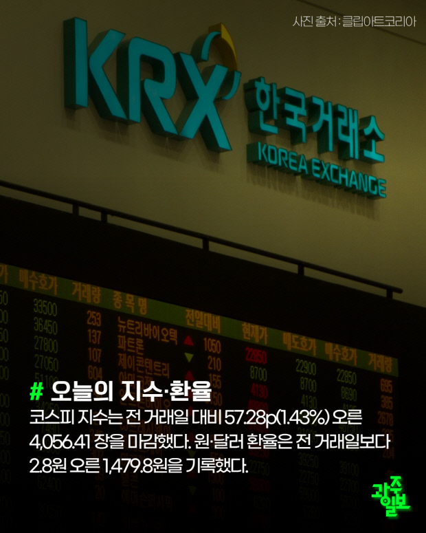 코스피 지수는 전 거래일 대비 57.28p(1.43%) 오른 4,056.41 장을 마감했다. 원·달러 환율은 전 거래일보다 2.8원 오른 1,479.8원을 기록했다.