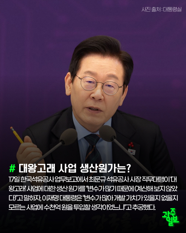 17일 한국석유공사 업무보고에서 최문규 석유공사 사장 직무대행이 ‘대왕고래’ 사업에 대한 생산 원가를 “변수가 많기 때문에 (계산해 보지 않았다)”고 말하자, 이재명 대통령은 “변수가 많아 개발 가치가 있을지 없을지 모르는 사업에 수천억 원을 투입할 생각이었느냐”고 추궁했다.