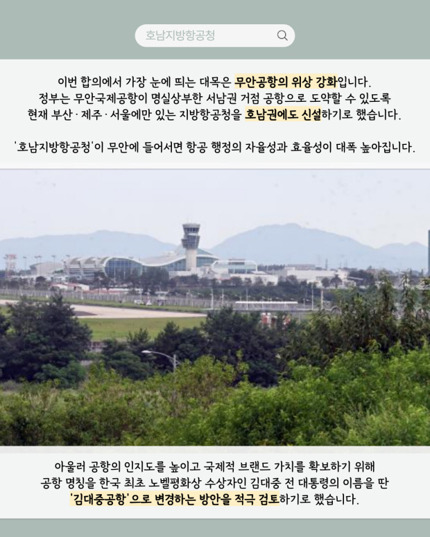 이번 합의에서 가장 눈에 띄는 대목은 무안공항의 위상 강화입니다. 정부는 무안국제공항이 명실상부한 서남권 거점 공항으로 도약할 수 있도록 현재 부산·제주·서울에만 있는 지방항공청을 호남권에도 신설하기로 했습니다.