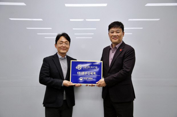 광주신세계 김성춘 사원대표(왼쪽)와 김기웅 지원팀장이 가족친화 우수기업 현판을 들고 기념촬영을 하고 있다.<광주신세계 제공>