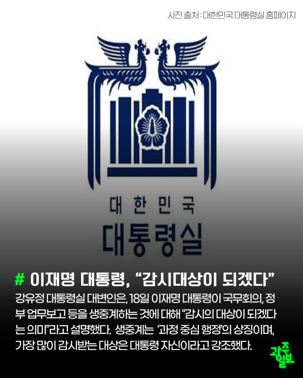 강유정 대통령실 대변인은 이재명 대통령이 국무회의, 정부 업무보고 등을 생중계하는 것에 대해 “감시의 대상이 되겠다는 의미”라고 설명했다. 생중계는‘과정 중심 행정’의 상징이며, 가장 많이 감시받는 대상은 대통령 자신이라고 강조했다.