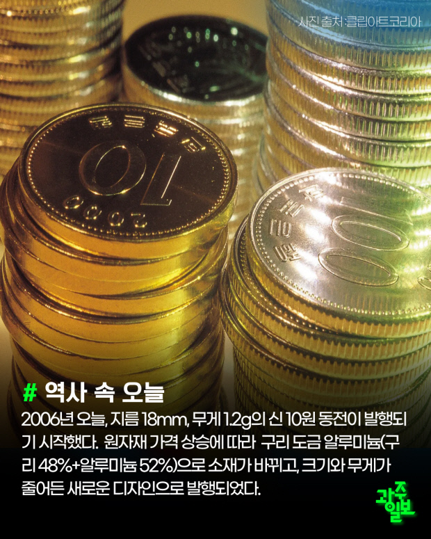 2006년 오늘, 지름 18mm, 무게 1.2g의 신 10원 동전이 발행되기 시작했다. 원자재 가격 상승에 따라 구리 도금 알루미늄(구리 48%+알루미늄 52%)으로 소재가 바뀌고, 크기와 무게가 줄어든 새로운 디자인으로 발행됐다.