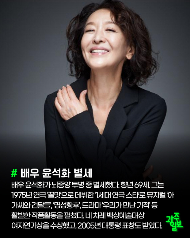 배우 윤석화가 뇌종양 투병 중 별세했다. 향년 69세. 그는 1975년 연극 ‘꿀맛’으로 데뷔한 ‘1세대 연극 스타’로 뮤지컬 ‘아가씨와 건달들’, ‘명성황후’, 드라마 ‘우리가 만난 기적’ 등 활발한 작품활동을 펼쳤다. 네 차례 백상예술대상 여자연기상을 수상했고, 2005년 대통령 표창도 받았다.