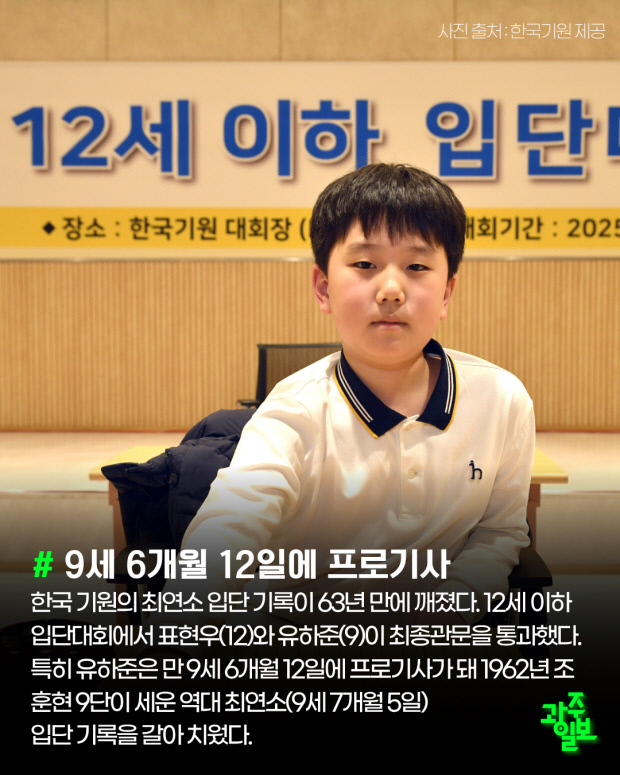 한국 기원의 최연소 입단 기록이 63년 만에 깨졌다. 12세 이하 입단대회에서 표현우(12)와 유하준(9)이 최종관문을 통과했다. 특히 유하준은 만 9세 6개월 12일에 프로기사가 돼 1962년 조훈현 9단이 세운 역대 최연소(9세 7개월 5일) 입단 기록을 갈아 치웠다.