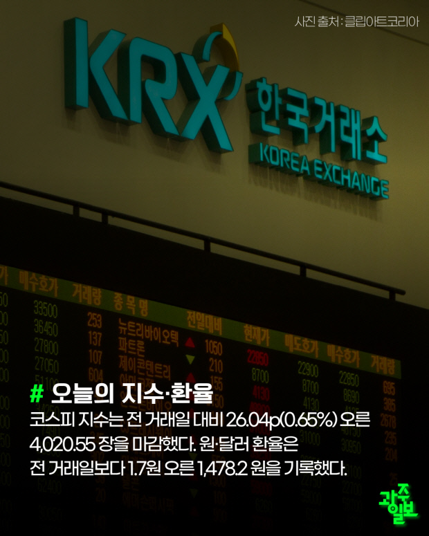 코스피 지수는 전 거래일 대비 26.04p(0.65%) 오른 4,020.55 장을 마감했다. 원·달러 환율은 전 거래일보다 1.7원 오른 1,478.2원을 기록했다.
