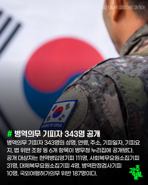 병역의무 기피자 343명의 성명, 연령, 주소, 기피일자, 기피요지, 법 위반 조항 등 6개 항목이 병무청 누리집에 공개됐다. 공개 대상자는 현역병입영기피 111명, 사회복무요원소집기피 31명, 대체복무요원소집기피 4명, 병역판정검사기피 10명, 국외여행허가의무 위반 187명이다.