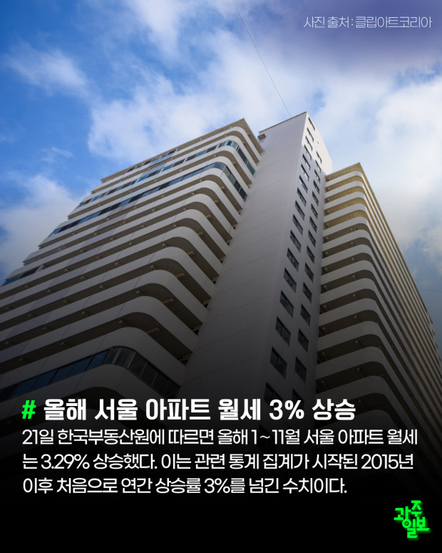 21일 한국부동산원에 따르면 올해 1∼11월 서울 아파트 월세는 3.29% 상승했다. 이는 관련 통계 집계가 시작된 2015년 이후 처음으로 연간 상승률 3%를 넘긴 수치이다.