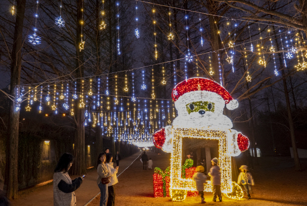 지난 20일 오후 담양 메타세쿼이아 산책로에서 방문객들이 화려한 조명 조형물을 감상하며 성탄 분위기를 만끽하고 있다. 메타세쿼이아 길 일원에서는 오는 24~25일 ‘7회 담양 산타축제’가 열린다. /김진수 기자 jeans@kwangju.co.kr