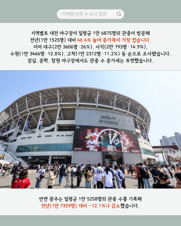 반면 광주는 일평균 1만 5258명의 관중 수를 기록해 전년(1만 7359명) 대비 -12.1%나 감소했습니다.