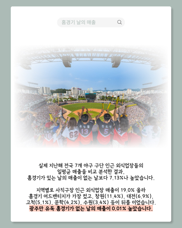 실제 지난해 전국 7개 야구 구단 인근 외식업장들의 일평균 매출을 비교 분석한 결과, 홈경기가 있는 날의 매출이 없는 날보다 7.13%나 높았고, 광주만 유독 홈경기가 없는 날의 매출이 0.01% 높았습니다.
