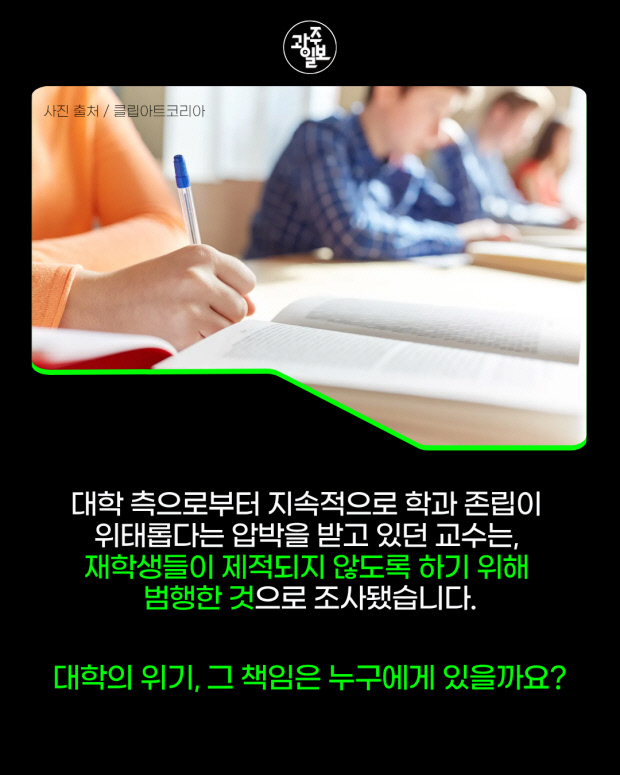 이들은 대학 측으로부터 지속적으로 학과 존립이 위태롭다는 압박을 받고 있었으며, 이에 재학생들이 제적되지 않도록 하기 위해 범행한 것으로 조사됐다.