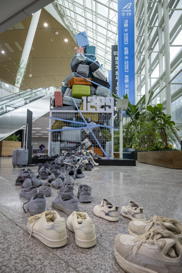 ![]() 제주항공 여객기 참사 1주기를 앞둔 25일 무안국제공항 로비에 희생자 수와 같은 179개의 여행용 캐리어를 쌓아 만든 추모 작품 ‘캐리어 179: 못다 한 여행의 기록’이 설치돼 보는 이들의 안타까움을 자아내고 있다. /김진수 기자 jeans@kwangju.co.kr |