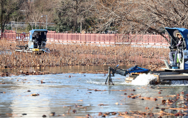 지난 26일 광주시 북구 양산호수공원에서 북구청 공원녹지과 직원들이 산책로를 이용하는 주민들에게 쾌적한 도심 환경과 연꽃 생육 환경 조성을 위해 호수 내 수초 제거 작업을 하고 있다. /나명주 기자 mjna@kwangju.co.kr
